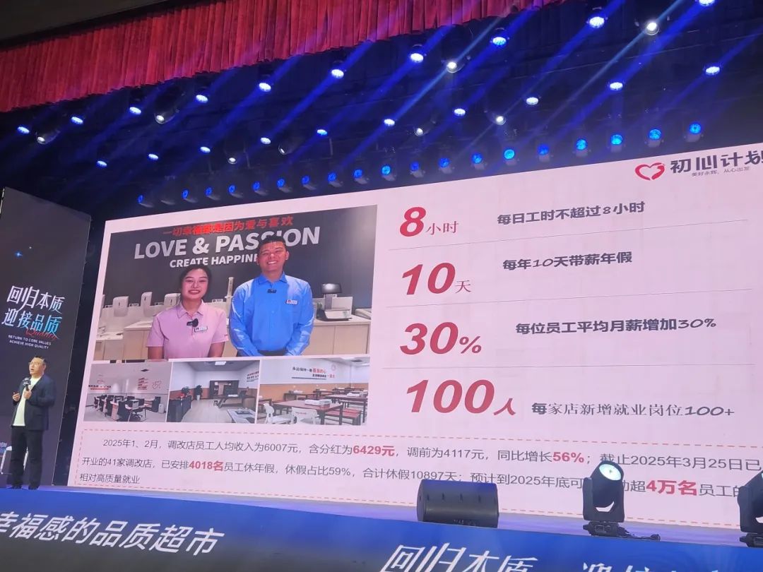 在3月29日召开的永辉超市2025年度供应商大会上,永辉超市副总裁、全国调改项目负责人王守诚公布了部分调改成果,其中在员工薪酬方面,今年1、2月,调改店员工人均收入为6007元,含分红为6429元,调改前为4117元,同比增长56%。截至3月25日,已开业的41家调改店,已安排4018名员工休年假,休假占比59%。